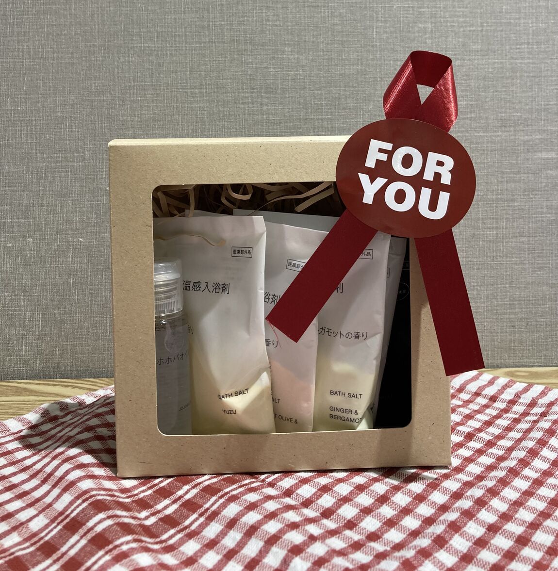 おすすめの入浴剤4種、ホホバオイル、おやすみ前の薬用重炭酸タブレットをセットにし、ラッピングしました。