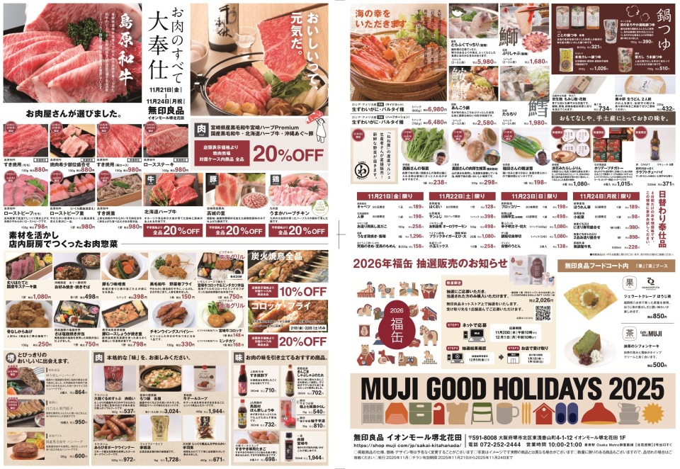 生鮮食料品売場では、11月21日(金)から11月24日(月祝)の期間限定で、お肉のすべてを大奉仕いたします。