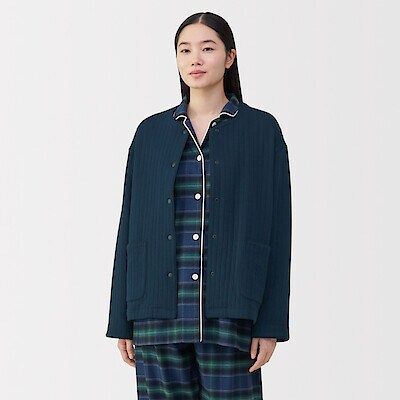 首元は、すっきりとしたノーカラーで前端や袖口、襟ぐりにはパイピングを施しました。